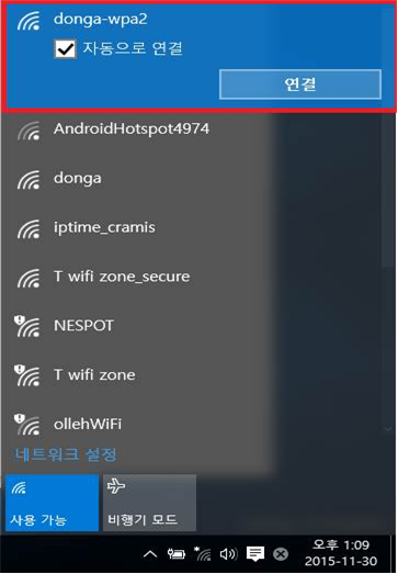 4. <그림4>무선네트워크 목록 중 ‘donga-wpa2’를 선택하여 [연결]을 클릭합니다.